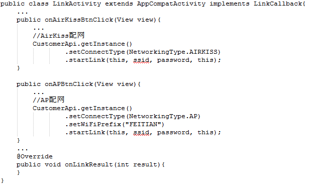 请求接口:public void startLink(Context context, String ssid, String password, LinkCallback callback);