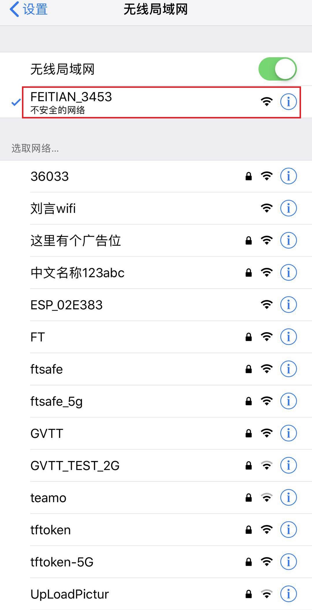 (3) 打开手机无线局域网(WIFI)查找到音箱开启的热点(音箱热点名称以“FEITIAN_”开头),手机连接该热点。如下图所示: