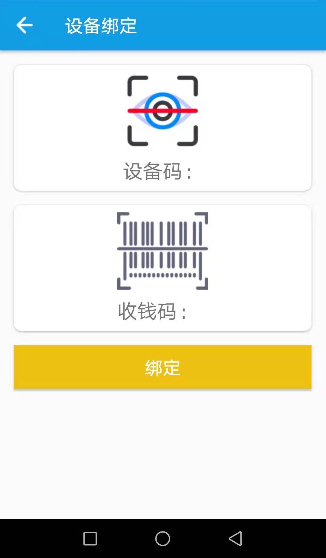 分别点击设备码和收钱码扫描将要绑定的设备码及收钱码,扫描完成后,点击【绑定】按钮完成绑定。