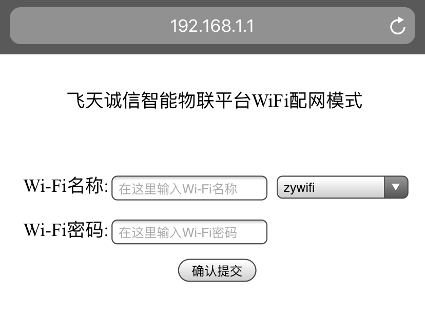 (4) 使用手机浏览器,地址栏输入192.168.1.1,在打开的页面输入音箱将要连接的WIFI/热点帐号及密码,如下图所示,输入完成后点击【确认提交】按钮,页面显示“正在连接Wi-Fi,请等待语音提示!”。