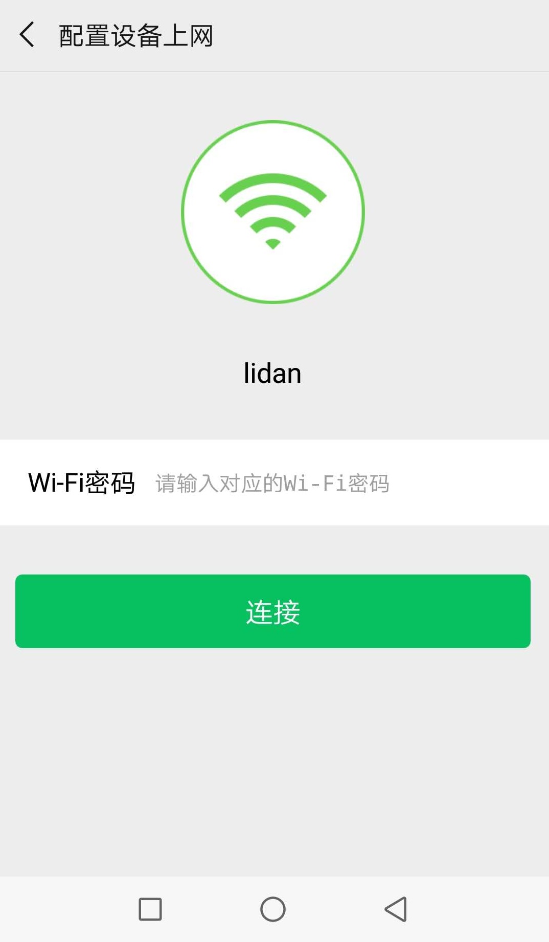 3.点击配网页面【开始配置】按钮,在“配置设备上网”页面,已经显示当前手机所连接WIFI名称,输入WIFI密码后,点击【连接】按钮,即可完成配网。如下图所示: